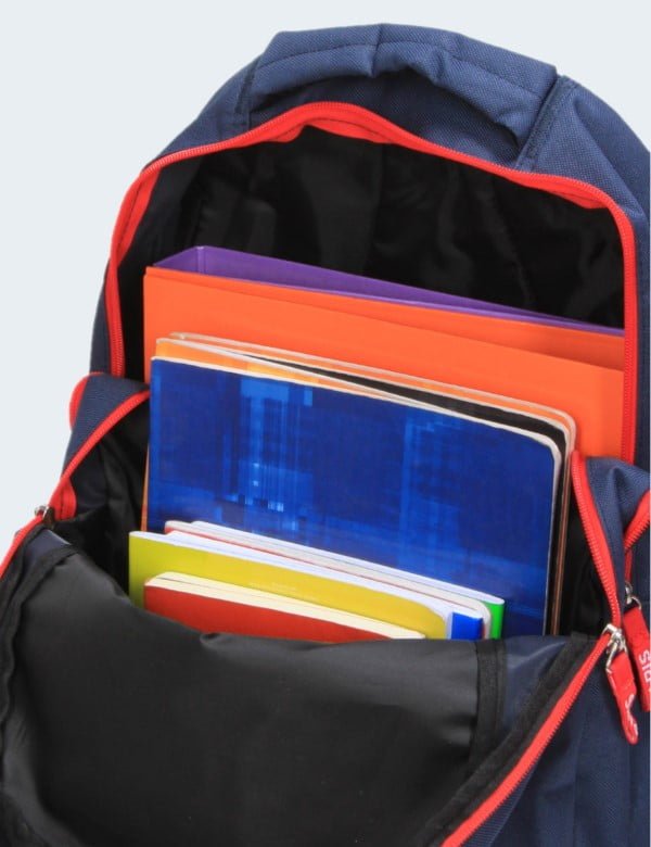 • Deux poches frontales zippées, une petite et une grande permettent de garder les accessoires tels que la carte de cantine, l’agenda et les crayons de couleur en accès rapide